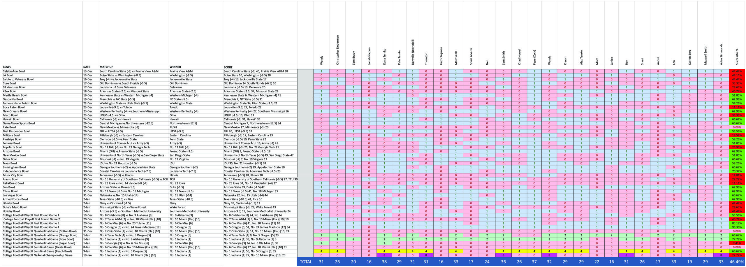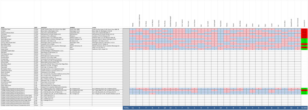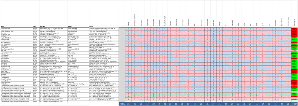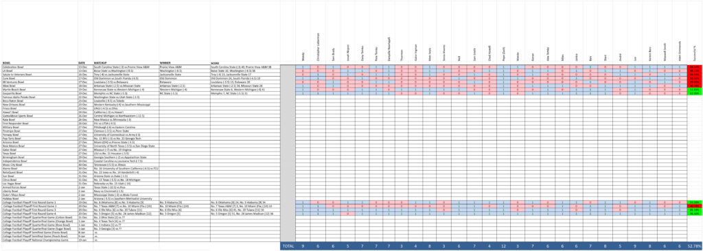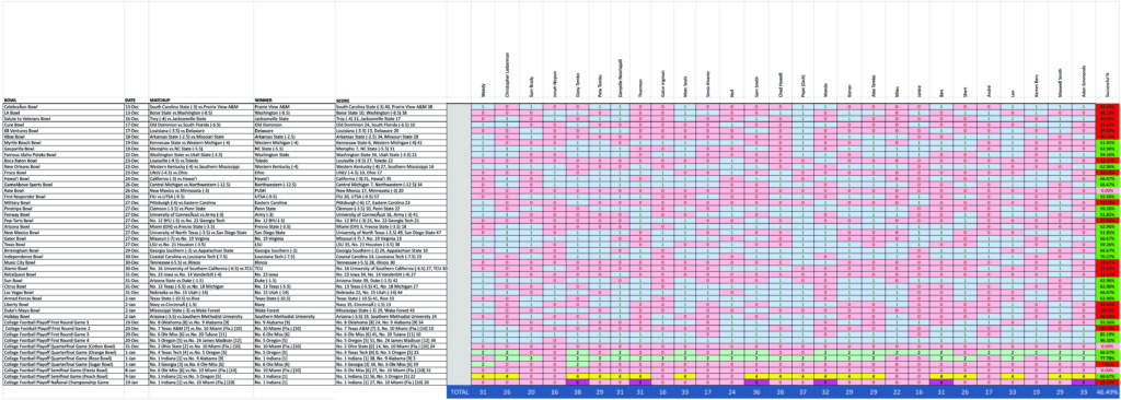 Overall, this was an especially challenging bowl season. For the first time that we can recall, there were three games where everyone got it wrong. One of those was due to an early PUSH and the other two were because NOBODY believed that Miami deserved to be there! Oh well!