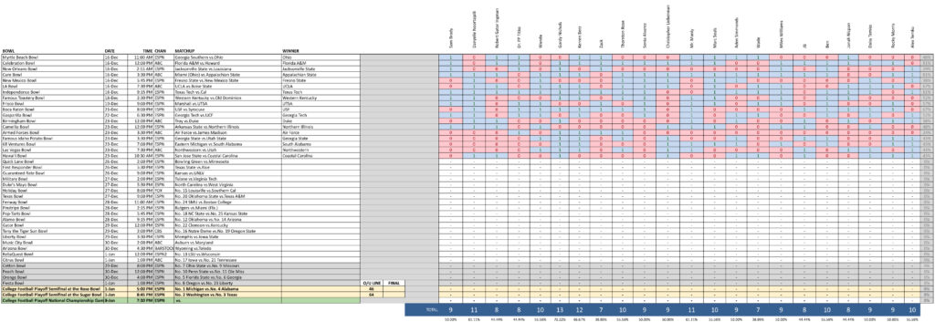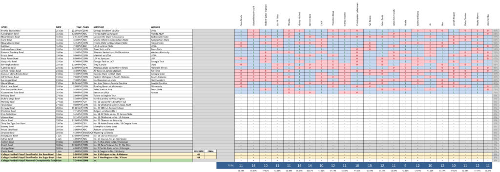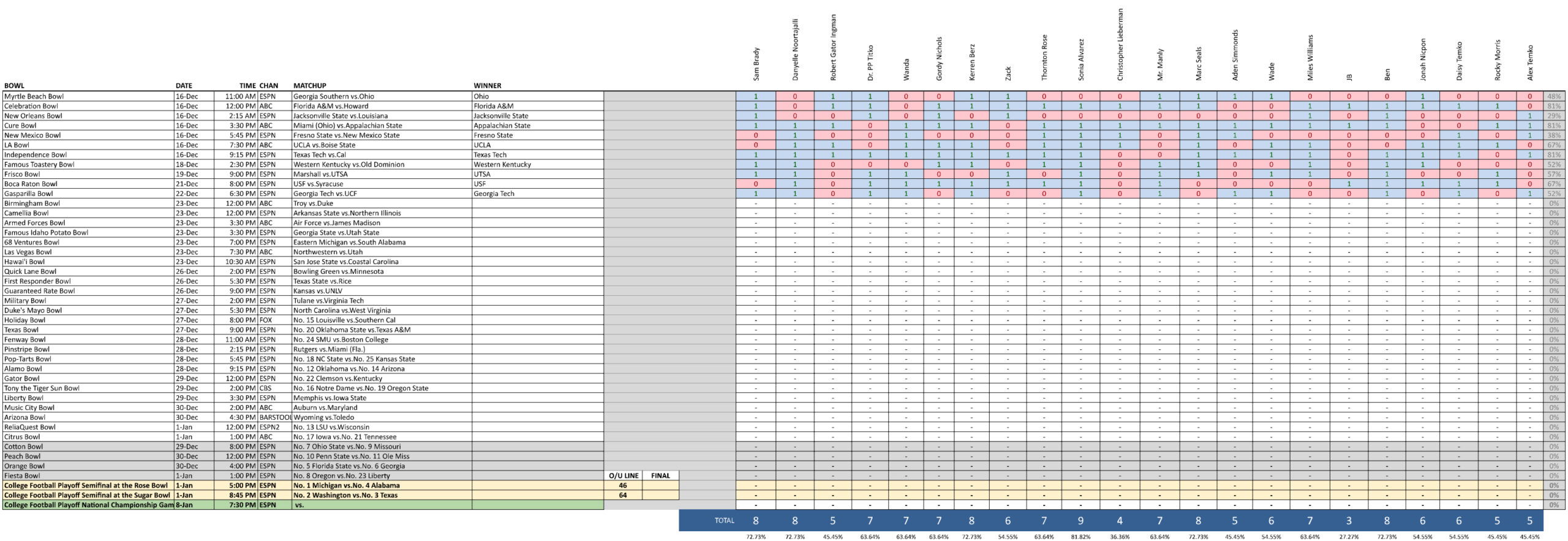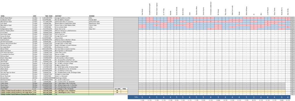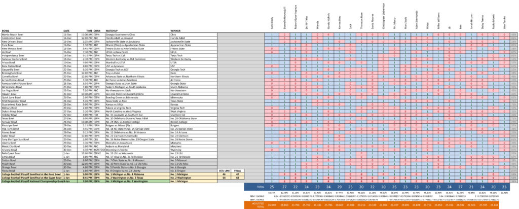 Looking ahead for a moment, the 24/25 bowl season promises to be fascinating as the 12-team playoff will force us here at the SBBPA to make an equitable adjustment to the scoring system so that as many people as possible have a chance going into the last few games. How will we do it? No fucking idea, but rest assured we’re hard at work putting the pieces together.