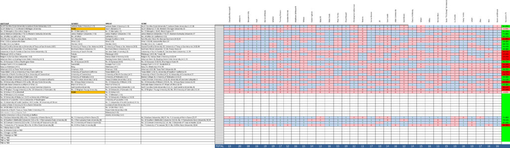 Example 1: In an act of perverse selfishness, Marshall decided that it would be better to forfeit their game against Army rather than play their committed game with a depleted roster. Though, perhaps this act was somewhat understandable given the beat down that FSU took from Georgia after playing their game with depleted roster. I mean, who wants to be embarrassed like that on national television? As a result, that game is designated a PUSH for all prognosticators and no point was awarded.