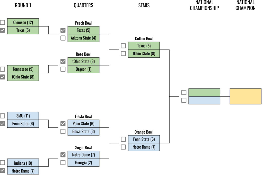 Just how do we know that Notre Dame and the Ohio State University are truly underdogs? Well, the SBBPA says so! Prognosticators were confident in picking Penn State (57%) and Texas (82%) to win their QF games. The opposite is true for the other two QF games. Just 12% of us picked Ohio State and 9% picked Notre Dame to win their QF games. And in the Semi-Final Games, only 6% picked Notre Dame and 9% picked Ohio State.