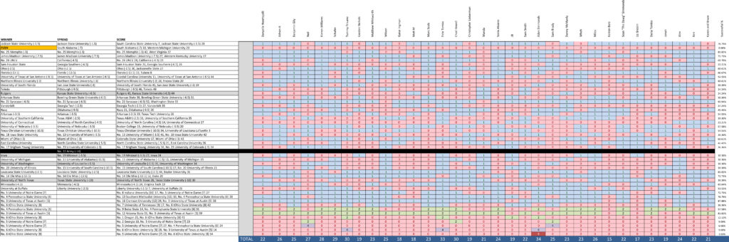 The numbers in the parenthesis is the spread. FSU is favored to win by a margin of 24.5 points over Charleston Southern. If a player picks FSU to win, they’ll get the point if FSU wins by MORE than 24.5 points. If a player picks Charleston Southern in a bet that FSU will not cover the spread (a good bet) and FSU wins by less than 24.5 points (or Charleston Southern wins the game), the player who picked the losing team will win the point as FSU’s win wasn’t impressive enough. That seems fair, RIGHT!? In this round, you’re picking performance, the team that will meet or exceed expectations.